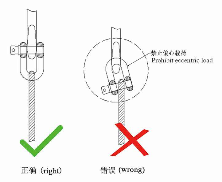 8.卸扣要正确的支撑着载荷,即作用力要沿着卸扣的中心线的轴线上,避免弯曲,不稳定的载荷,更不可以过载(如下图)。
