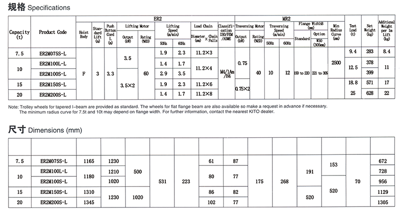 没有配供电电缆。关于供电方式,请于敝公司商量。 扬程(载重链)、按钮控制线、供电电缆的长度如在标准规格以外,请于敝公司商量。 载重链经过热处理,无法拼接使用,请注意。
